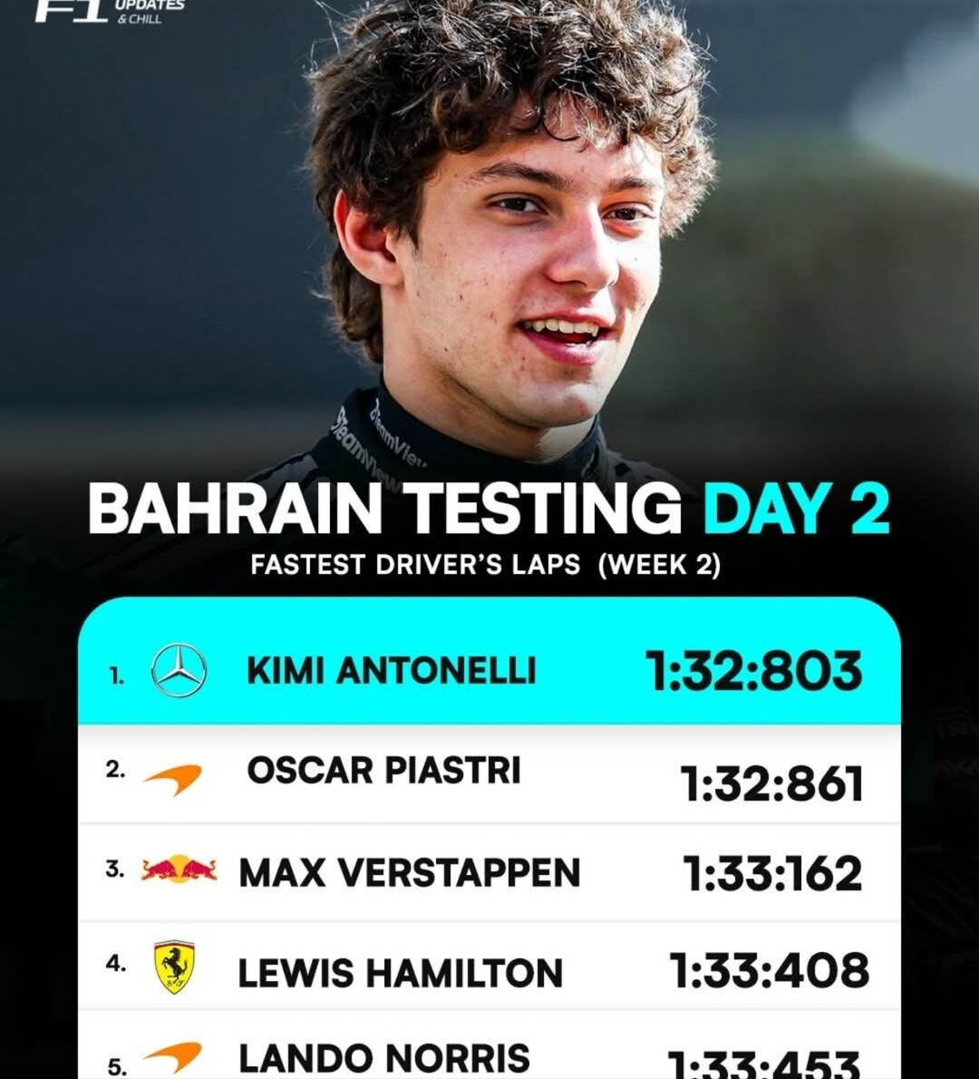 주목할 점은 안토넬리가 단순히 이날 하루만 빠른 것이 아니라는 점이다. 두 차례의 바레인 공식 시범주행에서 1·2차 테스트를 모두 통틀어 가장 빠른 기록이 모두 안토넬리의 이름으로 도배됐다.